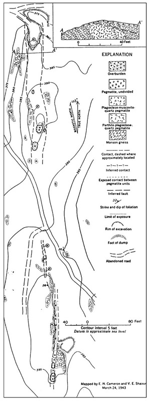 Cameron et al. (1954) reported that the quarry was worked briefly for feldspar around 1930. Subsequently it was worked for several months during World War II (1943) for feldspar and muscovite mica by a gentleman named Fausto Bertolini. The property was mapped by Cameron and Shainin at this time (fig. 18). They divided the site into the north and south pegmatites, and consisting of seven small excavations in three visible pegmatite exposures that strike due north. The three exposures, as mapped by Cameron et al.(1954), may be connected at depth.