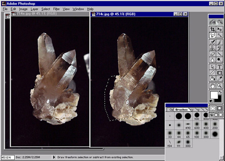 Figure 5. A. two different images of the same specimen as seen in Photoshop. The left version has good reflections on the termination and the rear crystal. The right version has a better reflection off the central face of the front crystal. Using Photoshops editing tools the central face on the right crystal is selected (dotted line) and copied onto the left photo. B. The composite image after copying the reflection onto the image. C. The final photo after retouching. |