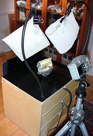 Authors Equipment· Sony MVC FD-83 digital camera. Captures 1024 x 768 pixel images in native mode, focuses to 1 cm, stores images on common floppy disks. 8-12 images per disk depending on image/subject. · Two 50 watt / flood SoLux 4700º halogen bulbs for illumination with frosted mylar diffusers over the bulbs · Minerals are photographed on black glass or white backgrounds. · The images are cropped, cleaned up, and optimized in Adobe Photoshop 5.0. · Computer: Dell XPi CD 166 MHz with 48 MB RAM · Iomega Zipdrive for storing images. Each disk is capable of storing 100 MB of images. · Epson Stylus 800 color inkjet printer prints at 1440 DPI though regularly used at 720 DPI.