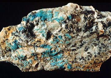| Figure 21 - Microlite from the Hollister quarry, South Glastonbury, Connecticut, collected by Richard Schooner and Peter Leavens. Peabody Museum of Natural History, Yale University Specimen no. 4223. Photo by William Sacco. | Figure 22 - Blue hyalite opal from the Simpson quarry, south Glastonbury, Connecticut. Collected by R. Behnke. Wesleyan University Natural History Museum Collection No. 13891. |