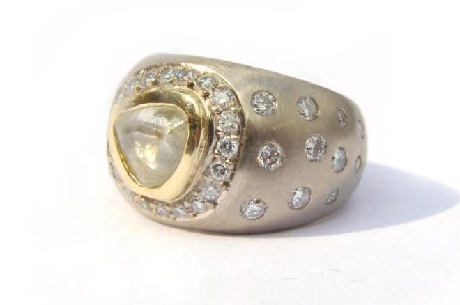 1.96 carat pale-gray macle diamond crystal set in a ring for Christian T. by Frederic Missir of Papeete, French Polynesia. |