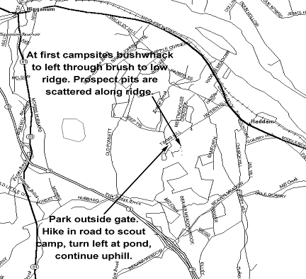 Directions: From NYC take Interstate 95 east to CT 81 north (exit 63?). Follow 81 north past the junctions of CT 80 and then CT 148. Go 2.9 miles past the junction of 148 to a right turn onto Parker Hill Road. Then take a quick (1/10 mile) left onto Beaver Meadow Road. Go approximately 4 miles to a four way intersection at a small bridge, turn left onto Hayden Hill Road. Follow to Timm's Hill Road, turn left. Go Approximately 2/10 mile up hill to where Timm's Hill Road makes a sharp right turn, you will see the scout camp entrance on your left. Park here. Walk in to the scout camp on your left (southwest) following the main road. Turn left before the pond and pass over a small bridge. Continue up hill on the trail to the camp sites. As you reach the first campsites, bear left off the trail, through the camp into the woods (east-southeast). Start bushwhacking down a gully and up again to a low ridge. The areais heavily overgrown. The collecting is along the ridge at several locations. Look for where other people have dug.